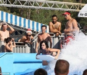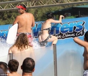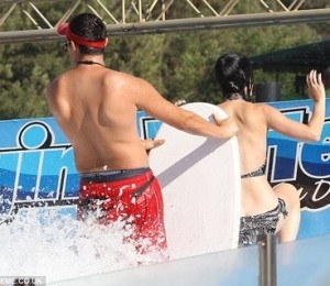 Cantareata in varsta de 27 de ani a fost sabotata de propriul costum de baie si a aratat mai mult decat si-ar fi dorit. Katy s-a aratat interesata de o sesiune de surfing si sub indemnul fanilor s-a aruncat pe placa si s-a lasat dusa de valuri. Din pacate, odata ce a ajuns in apa a intampinat o problema cu costumul de baie, slipul alunecandu-i si lasandu-i la vedere posteriorul, spre incantarea tuturor celor prezenti. Usor rusinata de postura in care a fost pusa, Katy nu a putut face decat sa se amuze de situatie si le-a facut cu mana fanilor.