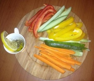 Vei avea nevoie de castraveti, morcovi, ardei sau orice alte legume, daca acestea nu iti sunt pe plac. Taie-le fasii si aranjeaza-le pe un platou, pe post de sticks-uri sanatoase.