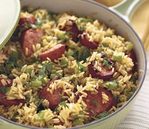 Se prajesc carnatii intr-o tigaie.Nu e nevoie de alte grasimi.Se taie carnatii feliute.Se adauga ceapa si se prajeste pana devine transparenta.Se adauga usturoiul si se prajeste inca un minut sau doua.Se adauga ciupercile si ardeiul si se parjeste pana cand acesta devine moale.Se aduaga rosiile si se da in clocot.Se adauga pasta de tomate si condimentele si se fierbe la foc redus timp de o ora.Se fierbe orezul dupa care se adauga sosul deasupra.