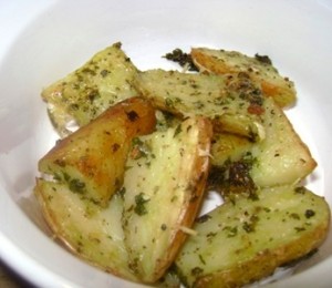 Cartofii se taie in jumatati si se pun la copt intr-o tava unsa cu ulei de masline.Intr-un castron se amesteca parmezanul, patrunjelul, mararul, smantana, sarea si piperul, dupa care se toarna peste cartofi si se lasa pana se rumenesc. Se serveste cu salata de cruditati sau cu salata de varza.
