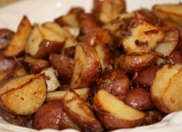 2. Se dau cartofii la cuptor pentru o oră sau până când furculița intră ușor în ei apoi se scot, se taie în jumătăți, se lasă deoparte și se dă focul de la cuptor mai încet.