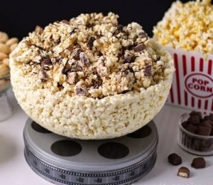 Daca vrei, poti sa folosesti lipici pentru ca vasul sa fie rezistent si floricelele sa se mentina lipite una de cealalta (dar asa nu va mai fi comestibil). Dar tanara Beth Jackson Klosterboer a folosit in mod rational bomboane de ciocolata alba care se topesc cu usurinta, in loc de lipici. Ea a pregatit un castron cu un amestec realizat din floricele de porumb si ciocolata alba topita, apoi a bagat amestecul la frigider. La final, tanara a umplut castronul cu floricele preparate dupa reteta ei speciala, ce contine unt de arahide si popcorn. Sursa: neatorama.com.