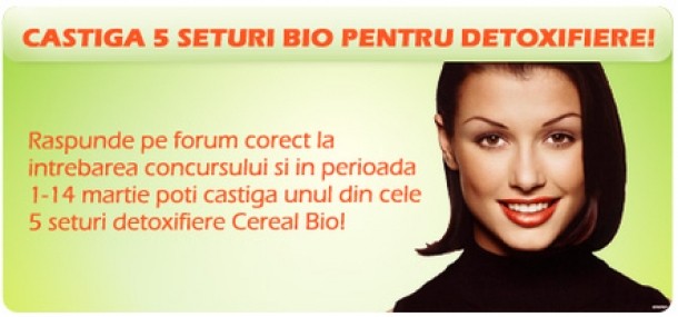 Intra pe forum accesand http://www.feminis.ro/forum/sanatate/sanatate-la-feminin/concurs-castiga-5-seturi-bio-pentru-detoxifiere-65692/#last, raspunde la intrebarea concursului si poti castiga unul din cele 5 seturi Bio pentru detoxifiere.