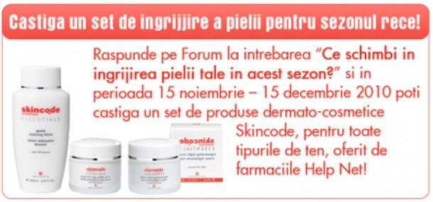 Raspunde pe forum la intrebarea “Ce schimbi in ingrijirea pielii tale in acest sezon?” si poti castiga un set de produse dermato-cosmetice Skincode, pentru toate tipurile de ten, oferit de farmaciile Help Net!