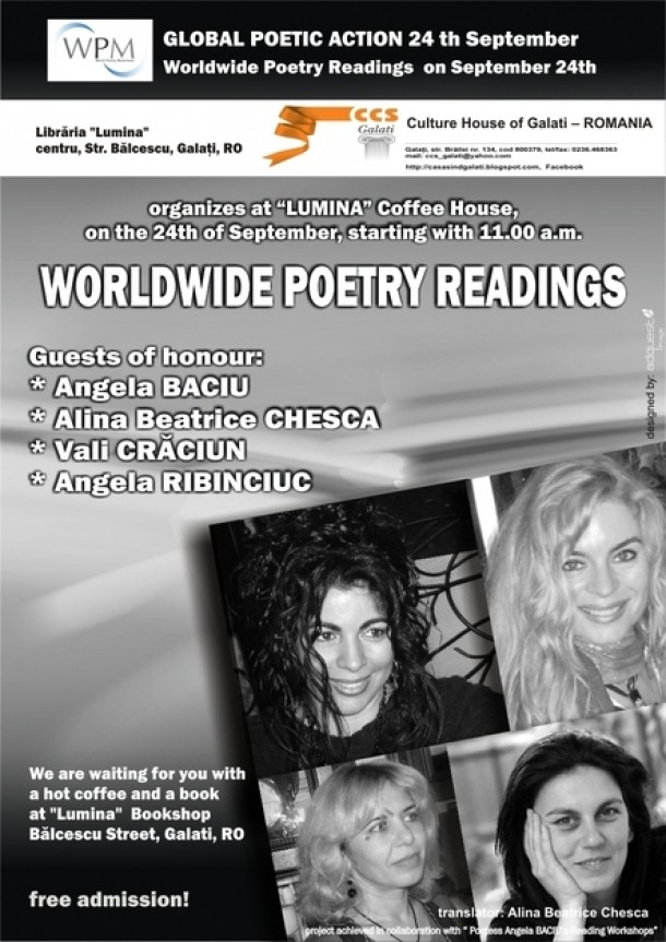 Ieri am trait clipe deosebite, cand am putut darui lumii intregi…o ora de Poezie…am fost extrem de onorata sa fiu organizatoarea unor lecturi poetice mondiale…va spun, am trait o poveste minunata. Am fost si noi, Romania, pentru o ora, in circuitul international intr-un proiect de exceptie. Chiar pe 24 septembrie, in aceeasi zi au avut loc 874 de lecturi poetice din 540 de orase si 107 tari , sustinand lecturi 100 000 de Poeti ai Schimbarii. Spiritul si bucuria acestei sarbatori le-am adus prin versul celor ce au citit: Angela RIBINCIUC, Vali CRACIUN, Aline Beatrice CHESCA si subsemnata. De fapt, aceasta Miscare Poetica Mondiala (W.P.R.) a fost fondata in Medelin (Columbia) pe 9 iulie 2011 si, in atat de putin timp, in aproape trei luni, a reusit incorporarea a numeroase lecturi, organizatii si festivaluri de poezie. Fiecare dintre noi am venit la Libraria "Lumina" cu o particica de viata si vers, am venit cu increderea si credinta ca Poezia ne poate face mai buni, mai blanzi, mai iubitori… A citit si poetul Coriolan PAUNESCU un poem de suflet, iar cativa din public au subliniat importanta organizarii unor asemenea evenimente. Le multumesc tuturor care ne-au fost aproape si, chiar daca nu a fost prezent un public numeros, sper ca poezia, arta si frumosul sa ne pastreze din curatenia sufletului.