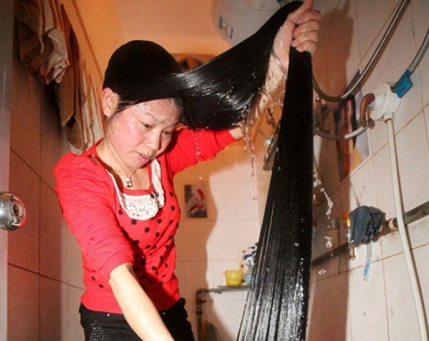 Cen Yingyuan masoara 1.52 m inaltime si are o podoaba capilara lunga de 2 metri! Femeia colectioneaza firele de par care ii cad, adunand aproximativ 50 de grame de par pe an.