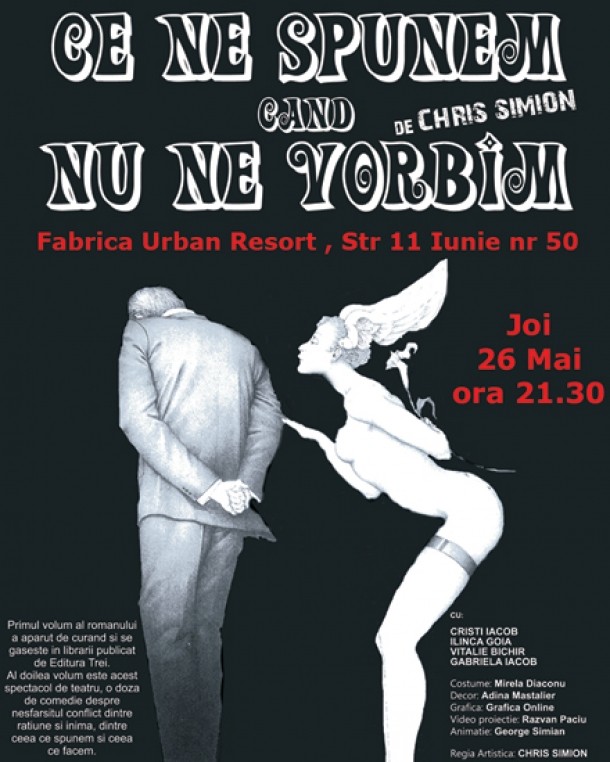 In acest spectacol ii veti regasi pe actorii din "Dragostea dureaza 3 ani": Cristi Iacob, Ilinca Goia, Vitalie Bichir si Gabriela Iacob. Text si regia artistica: CHRIS SIMION.