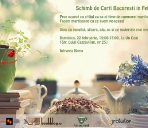 Duminica, 22 februarie, de la 15:00 la 17:00, la ceainaria La Un Ceai (Str. Luigi Cazzavillan nr. 25) are loc editia Schimb de Carti Bucuresti din februarie. Intrarea este libera. Schimbul nu este definitv si nici obligatoriu (daca vrei doar sa cunosti oameni pasionati de lectura, poti participa fara sa aduci carti).