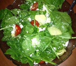Este vorba de salata de spanac (baby spinach) cu avocado, urda si rosii.
