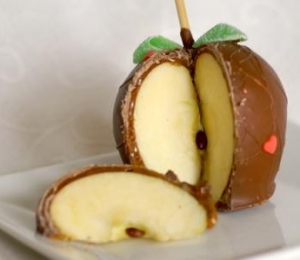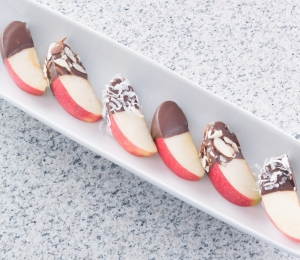 Pentru a transforma un banal măr şi două cuburi de ciocolată neagră într-o gustare pe cinste, taie mărul felii apoi rade peste acestea ciocolata neagră.