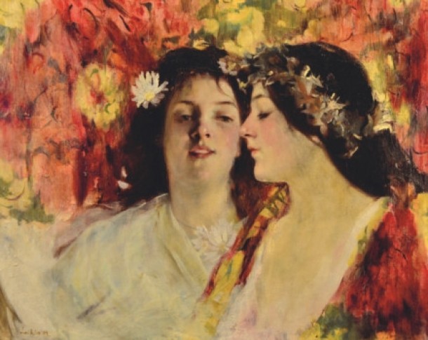 Pictura "Doua fete" (foto), semnata de Stefan Luchian, a fost vanduta miercuri, in cadrul unei licitatii Goldart, cu 300.000 euro, suma record pe piata de arta romaneasca.