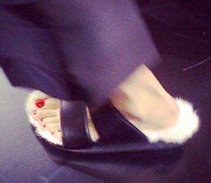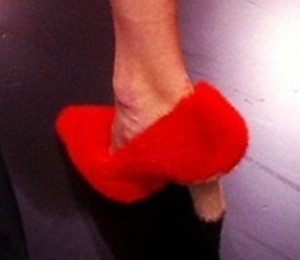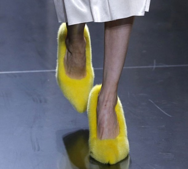 Modelele care au defilat pe podium au purtat incaltari ce constau in pantofi, sandale si papuci cu... blana.