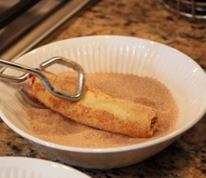 Imediat ce ruloul s-a rumenit, scoate-l si tavaleste-l printr-un amestec de zahar si scortisoara.