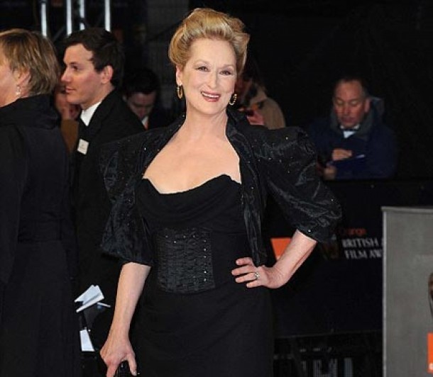 Meryl Streep si-a facut aparitia intr-o rochie lunga, neagra, creatie Vivienne Westwood si a aratat mai bine decat multe tinere actrite prezente la eveniment. Corsetul rochiei i-a evidentiat silueta si bustul. Cu parul prins si o jacheta scurta, care ii acoperea umerii, actrita semana foarte mult cu personajul Margaret Thatcher, rol pe care il joaca in filmul "The Iron Lady" si pentru care a primit premiul pentru "Cea mai buna actrita".