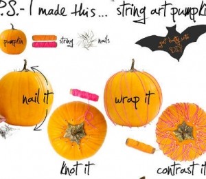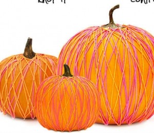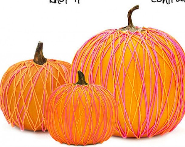 Ai nevoie de: un dovleac, cateva cuie de mici dimensiuni, sfoara subtire portocalie si fucsia.