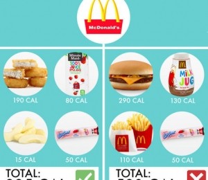 Combinatia cu cele mai putine calorii: Chicken McNuggets, Sucul de mere, Feliile de mere si Iaurtul cu capsuni care are un continut scazut de grasimi.