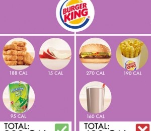 Combinatia cu cele mai putine calorii: 4 bucati de Nuggets de pui, Felii de mar si Suc de mere.