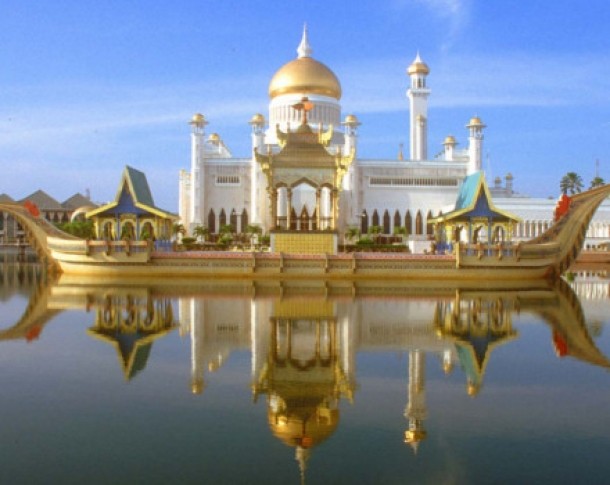 Moscheea Sultanului Omar Ali Saifuddin din Brunei este construita in mijlocul unei lagune artificiale din capitala tarii. Constructia are peste 50 de metri inaltime, iar cupolele sale sunt invelite in aur.