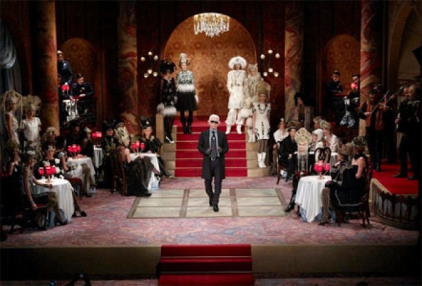 Calatorie in timp, cu aer rece si discursuri rusesti. Catifea rosie si uniforme, doar cateva ingrediente intr-un tablou care imbina Parisul si Moscova de altadata. Nu fabulez, doar descriu punerea in scena a ultimei prezentari de moda Chanel.