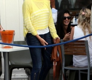 Charlize Theron a purtat un maieu alb si un top galben cu dungi, combinate cu o pereche de blugi, sandale portocalii si o geanta asortata.