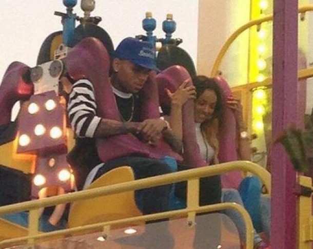 Un admirator al cantaretuluia postat pe Twitter o fotografie cu Chris si iubita sa dandu-se intr-un carusel din incinta parcului de distractii Orange County Fair.