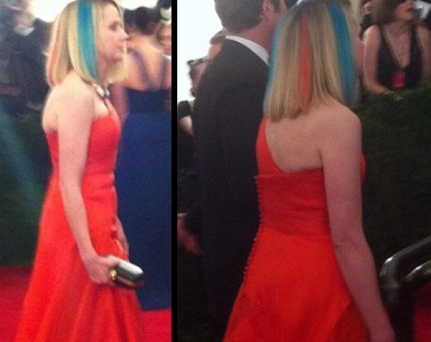 Pentru a respecta tematica evenimentului - Punk: Chaos to Couture - ambitiosul CEO al Yahoo a renuntat la look-ul cuminte si si-a vopsit suvite groase de par in nuante de albastru si rosu. Nici tinuta purtata de Marissa Mayer nu putea trece neobservata, intrucat a optat pentru o rochie rosie.