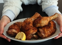 4. Introdu tava la cuptor, unde o vei lăsa preţ de 20 de minute. În acest timp, foloseşte o lingură pentru a lua zeamă din tavă, cu care vei acoperi puiul din când în când.