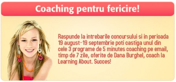 Raspunsurile cele mai "rasunatoare" vor fi premiate cu un program de 5 minutes coaching pe email, timp de 7 zile. Astept comentariile voastre la http://www.feminis.ro/bloguri/dana_burghel/cum-sa-fii-cea-mai-buna/astazi-lansam-concurs-832! Succes!