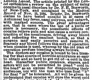 The New York Times cita un alt articol dintr-o alta publicatie, in care se arata ca substanta a fost intrebuintata de diversi subiecti pentru tratarea afectiunilor nazale. Un medic pe nume F.H. Bosworth spunea ca a testat cocaina in 40 de cazuri pe niste pacienti care sufereau de alergii de toamna, polipi nazali si guturai (inflamatia membranelor mucoase, in special ale celor din nas si gat) si ca testarea lui a avut succes.