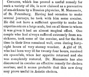 De pilda, unul dintre aceste articole, publicat chiar in prestigiosul The New York Times din 2 septembrie 1885, relata: "noile intrebuintari ale cocainei au fost aplicate cu succes in New York si acestea includ afectiuni precum alergie, guturai si dureri de dinti, iar acum se experimenteaza o alta intrebuintare in cazurile de rau de mare".