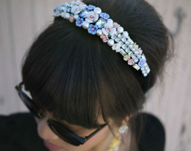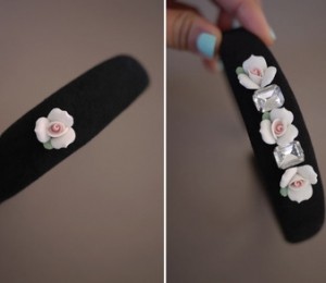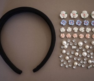 Ai nevoie de: o bentita lata de aproximativ 3 cm, strasuri, perle si floricele din plastic, lipici.