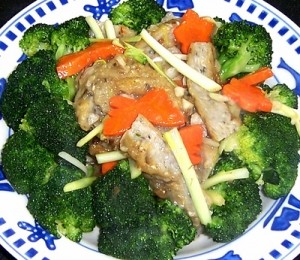 Se incalzeste cuptorul la 200 grade Celsius si se lasa tava la incins. Pentru a marina pestele, se amesteca uleiul de masline, condimentele si sucul de lamaie.Se usuca pestele intr-o tigaie de teflon timp de un minut, dupa care se pune in tava, la cuptor, impreuna cu prazul si cu amestecul marinat preparat la inceput. Se coace timp de 15 minute pana cand pestele este gata. Se serveste cu garnitura de broccoli fiert.