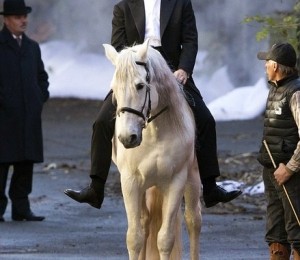 Desi ii lipseste armura, Colin Farrell arata impecabil in costum, plimbandu-se calare pe strazile din Brooklyn.