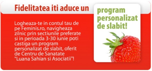 Descopera mai multe informatii pe pagina de concurs "Fidelitatea iti aduce un program personalizat de slabit", afla toate regulile concursului si ceea ce te asteapta...si nu mai sta pe ganduri! Fii tu cea care va arata senzational pe plaja in acest sezon!