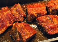 1. Se pun cotletele într-o tavă întinsă, tapetată cu hârtie de copt și se stropesc cu 1 lingură de ulei, după care se pune rozmarinul tocat, zeama de lămâie, sare și piper, timp în care se preîncălzește cuptorul.