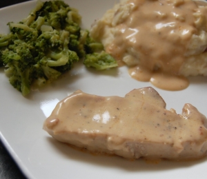6 cotlete de porc, 1 linguriță de pudră de usturoi, 1 linguriță de sare, 2 ouă batute, ¼ cană de făină, 2 căni de pesmet, 4 linguri de ulei de măsline, 1 cană de supă cremă de ciuperci, ½ cană de lapte, 1/3 cană de vin alb