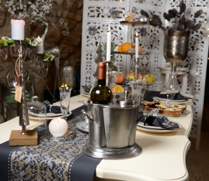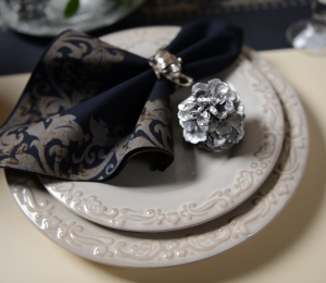 În cazul mesei de Revelion, pentru un efect dramatic, poți alege un runner sau o față de masă care să conțină negru, cu servețele asortate, pe care sa îl combini cu nuanțe metalice de argintiu, auriu sau arămiu. Poți puncta masa cu sfeșnice și candele care să se completeze reciproc și să creeze un joc de lumini inedit. Alege argintiul pentru un efect elegant. Sfeșnicele pot fi dintre cele mai inventive, cum este cel din metal gri care îți permite să-l ornezi cu bobițe și crenguțe de brad sau o coroniță decorativă rustică.
