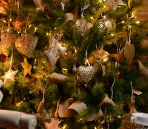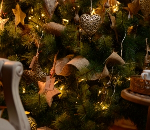 O variantă elegant-rustică a bradului ar fi cea în care combinăm decorațiuni aurii, delicate, din metal perforat, cu alte elemente din lemn și inserții din pâslă. Putem asorta mini felinare sferice și ghirlande cu sfoară și inimi aurii pentru un aer festiv.