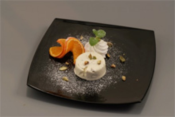 Bate galbenusurile, zaharul pudra si Grand Mariner-ul pana cand capata consistenta unei creme, adauga sucul de portocale si 20 de grame de fistic. Incalzeste apoi gelatina, amestec-o cu putina crema, iar dupa, amesteca totul cu multa grija. Pune-o apoi la rece pana ce se intareste gelatina si adauga frisca. Aseaza-o in 6 forme si las-o la frigider minimum 3 ore. Aranajeaza crema in final pe farfurie si decoreaza cu portocale. Restul de fistic se presara deasupra.