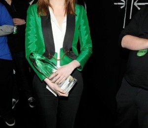 Julianne Hough a defilat pe covorul rosu intr-o rochie aurie, cu maneci. Rochia ii scotea in evidenta spatele printr-o taietura spectaculoasa care incepea chiar deasupra posteriorului.