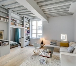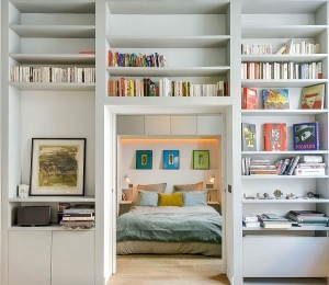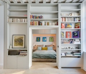 Biblioteca separă partea de dormit de cea de relaxare, dar încadrează, de asemenea, patul, care este vizibil din living. În vreme ce restul apartamentului este gândit în tonuri de alb, biblioteca şi dormitorul sunt mai pline de culoare. Totuşi, schimbul este făcut într-o manieră atât de armonioasă, încât parcă totul vine de la sine.