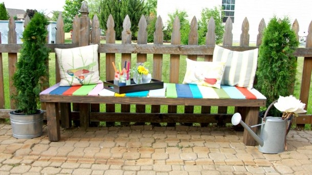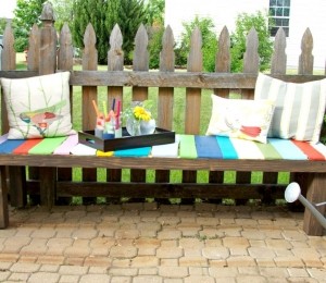 6. Ca banca să se încadreze perfect în designul grădinii tale, lipeşte-o de gard şi aşază pe ea câteva pernuţe colorate, iar de o parte şi de alta a ei aşază tuia plantat în găleată de tablă.