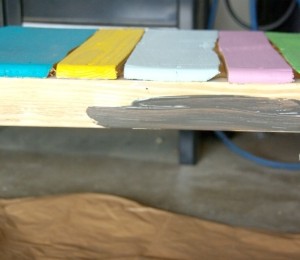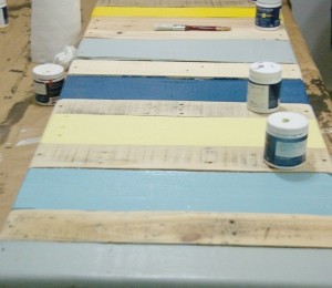 3. Dă paletul cu grund şi lasă să se usuce 2 ore, după care, vopseşte scândurile de deasupra paletului în culorile preferate şi lasă lemnul să îşi tragă vopseaua pentru 2 ore. Eventual, va trebui să mai dai o mână de vopsea şi să laşi încă 2 ore să se usuce.