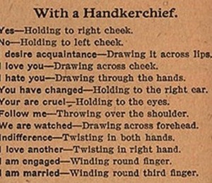 O serie de gesturi, facute corect si la momentul potrivit, puteau transmite barbatului (logodnicului) "Te iubesc", "Da" sau "Nu". Iata un ghid al flirtului cu ajutorul batistei, care dateaza din 1800: