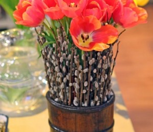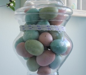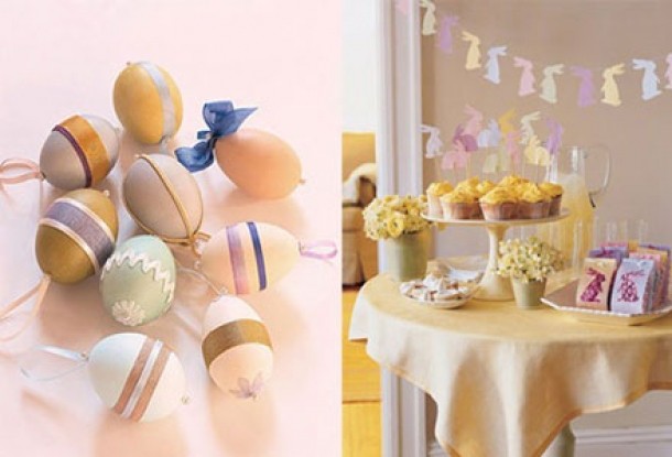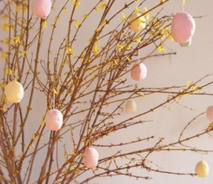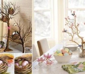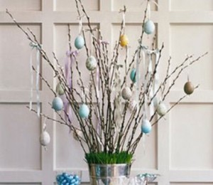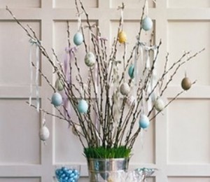 Iei cateva crengute si, fie le impodobesti cu oua de plastic colorate pe care le cumperi din magazin, fie le decorezi cu oua facute din material, umplute cu vata, pentru a nu fi prea grele si pe care sa le decorezi cum vrei tu. Pe oricare dintre aceste variante ai alege-o, pune aceste crengute intr-o vaza mare intr-unul din colturile sufrageriei si in vaze mai mici, rasfirate in restul casei. Va arata foarte bine. La fel poti face si cu plantele mai mari din ghivece sau daca locuiesti la casa, poti sa iti decorezi copacii din curte sau iedera de pe casa.