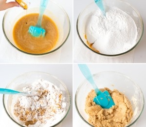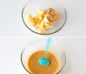 2. Pune untul alături de untul de arahide într-un bol şi încălzeşte amestecul în cuptorul cu microunde, preţ de 2 minute. Scoate bolul, amestecă bine şi mai încălzeşte 1 minut. Repetă operaţiunea pentru ultima dată apoi adaugă extractul de vanilie, sarea şi zahărul pudră. Amestecă până când obţii o compoziţie omogenă. Adaugă o jumătate de cană de alune mărunţite şi amestecă din nou.