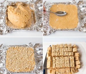 Pentru 50 de caramele ai nevoie de: 1 cană de unt nesărat, 1 cană de unt de arahide, 1 linguriţă de extract de vanilie, un praf de sare, 3 căni şi jumătate de zahăr pudră, 1 cană de alune zdrobite.