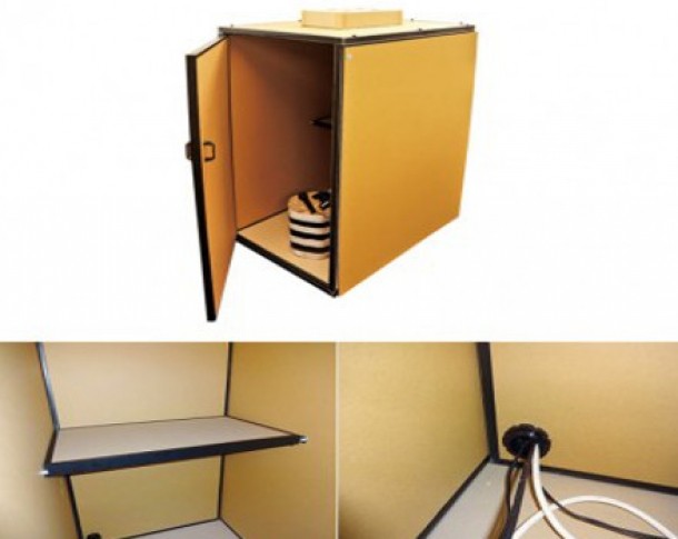 Obiectul salvator este fabricat din panouri stratificate de carton, are o gaura mica prin care intra cabluri, pentru eventualitatea in care vrei sa tipi cand iti citesti mesajele de pe facebook, sau pentru cazul in care intentionezi sa stai 13 ore in interiorul cutiei, aceasta a fost prevazuta si cu sistem de ventilatie.