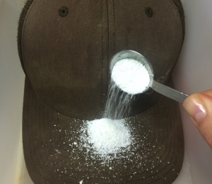 Pune o mână de detergent pe cozorocul şepcii tale. Apoi, introdu treptat şapca într-o găleată cu capac. Lasă şapca să se scufunde în apă iar apoi pune capacul găleţii.