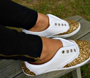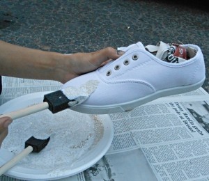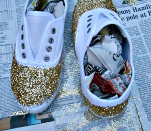 Pune tenişii pe un ziar. Cu ajutorul pensulei, acoperă toata partea din faţa a tenişilor cu lipici. Pune apoi peste lipici, înainte ca acesta să se usuce, sclipici din belşug.
